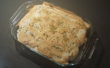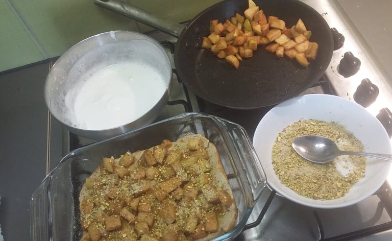 A liszteket a 3 tojással, édesítővel (nálam stevia/eritrit) és pici vízzel összekeverem, 180 fokon addig sütöm amíg már nem ragad (kb. 20-25 perc, tűpróba!). Közben az almát kockákra vágom, fahéjjal megpárolom. A tésztát óvatosan két félbe vágom, majd rárétegezem az alma, lekvár és az apróra tört, édesítővel kevert pisztácia felét. Ugyanezt megismétlem a "piskóta" másik felével, majd a tojásfehérjét édesítővel (plusz mehet bele egy kis szódabikarbóna is, segít az állagon) habosra verem és ráöntöm a rétegekre. 150 fokon mehet vissza a sütőbe a tojáshab barnulásáig.