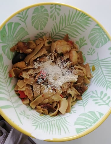 A tésztát megfőzöm, a rákot, surimit, tengergyümit a fokhagymán megpárolom, a főtt, leszűrt tésztába keverem. Az olívát, pórét, paradicsomot apróra vágva hozzákeverem majd leöntöm a tejszínnel, ízlés szerint fűszerezem és max. 10 perc alatt összepárolom. Készíthető akár lazaccal is, de tojással is el tudom képzelni, akinek belefér mehet a tetejére kis parmezán vagy más sajt - a zöldségek pedig variálhatók tetszés, és a hűtő tartalma szerint :)