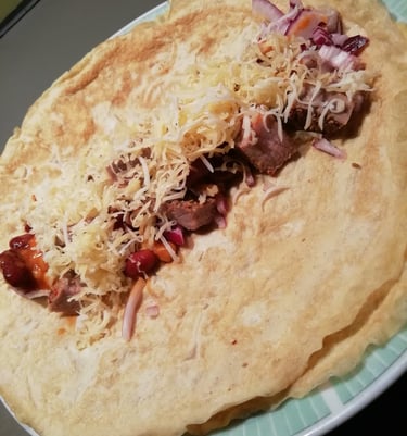 A töltelék megintcsak ízlés és fantázia kérdése, ebben itt most a mexikói feeling kedvéért marhacomb, bab, kukorica, lilahagyma, salsa, és némi bűnös tejföl és sajt. (Szigorúbb diéta esetén azért utóbbi kettő, sőt a bab és a kukorica is megfontolandó)😉)