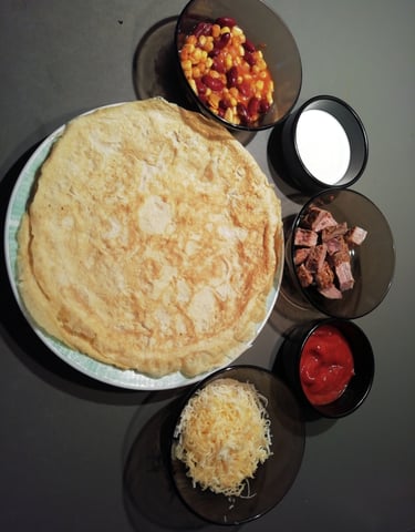Az enyém itt most 20 g szezámliszt, 2 egész tojás és 2 tojásfehérje keveréke, amit csomómentesre kevertem és szimplán mint egy palacsintát, kisütöttem.