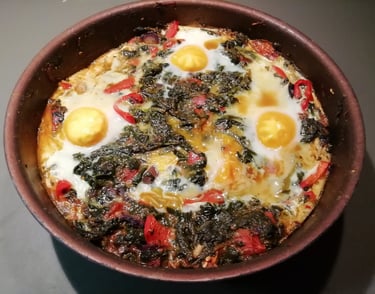 Az eredeti, paradicsomos izraeli "lecsót" biztosan sokan ismeritek, én imádom, ezt variáltam most át egy kicsit zöldebb verzióra ahol a rengeteg paradicsomot legalább ennyi spenót váltotta le. Sajnos ez most fagyasztott levelekből készült, frissből az igazi nyilván - de azért így se lett rossz :) ☝️