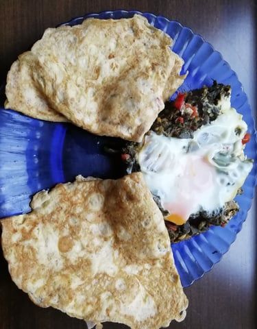 Mellé tojásból készült tortillába (tojás+útifű maghéj vagy valamilyen liszt alternativa, palacsintasütőben kisüt) kerülhet tetszőlegesen csirke, akár hal, sonka, sajt, ki mire vágyik vagy fér bele éppen.