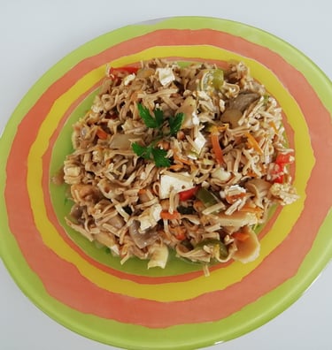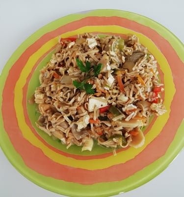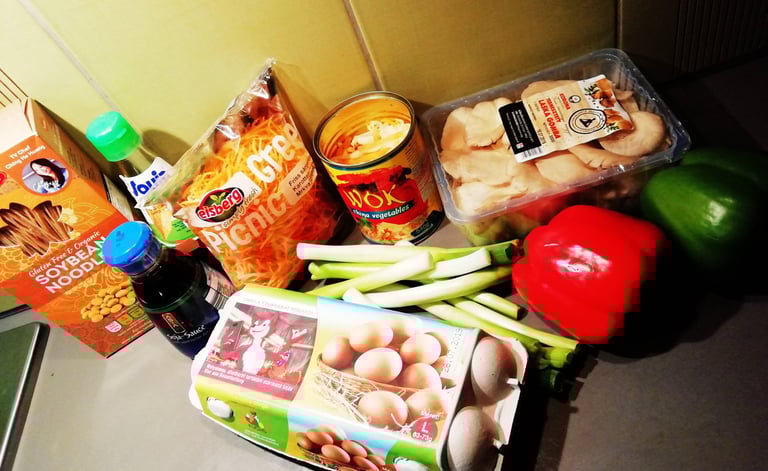 Hirtelen, forró serpenyőben a mogyoróolajon megpirítjuk a zöldségeket, majd hozzáadjuk a tésztát. Tovább pirítjuk, majd ha megpirult a tészta is, a szószokkal ízesítjük, végül hozzáadjuk a tojáscsíkokat. Az apróra vágott újhagymával és mogyoróval, esetleg lime-al ízesítjük.