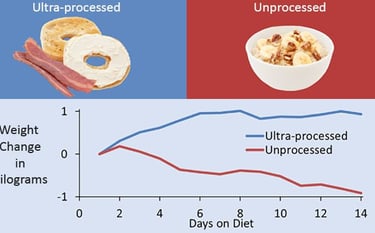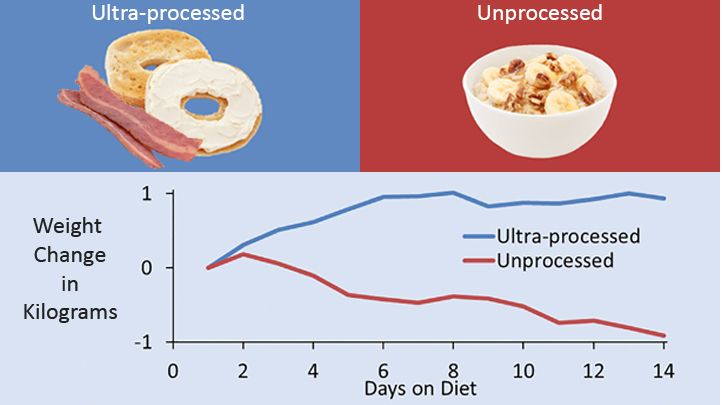 Egy olyan kísérletről van szó, ahol a csoport egyik része 2 héten át zsírszegény görög joghurtból, pulykás szendvicsből, chipsből és light szénsavas üdítőből álló diétát kapott, míg a kontrollcsoport menüje csak és kizárólag feldolgozatlan ételekből állt (lásd képek)